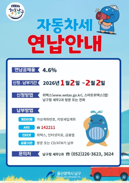 (포탈뉴스통신) 울산 남구는 오는 2월 2일까지 올해 1월 자동차세 연납 신청을 접수한다고 밝혔다.