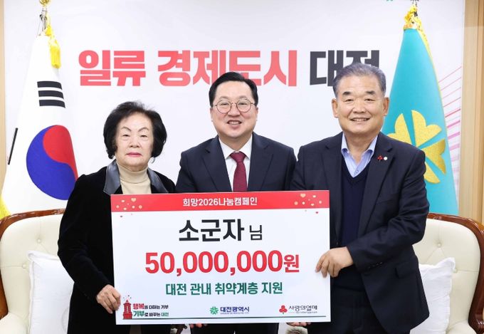 (포탈뉴스통신) 대전시는 15일 오전 시청 10층 응접실에서 아너소사이어티 회원인 소군자 기부자(124호)로부터 대전사회복지공동모금회를 통해 관내 취약계층 지원을 위한 성금 5천만 원을 전달받았다.