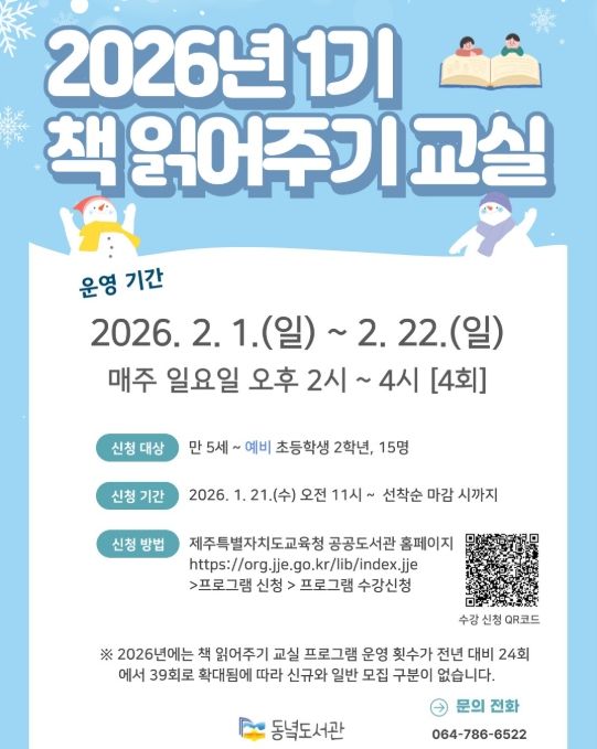(포탈뉴스통신) 제주도교육청 동녘도서관은 2월 1일부터 22일까지 평생교육실에서 유아 및 저학년 어린이의 독서 흥미와 창의력 향상을 위한 ‘2026년 1기 책 읽어주기 교실’을 운영한다.