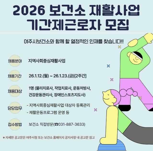 (포탈뉴스통신) 여주시보건소는 지역 내 등록장애인과 예비장애인들의 건강관리를 위한 지역사회중심재활사업 추진을 위해 1월 12일부터 1월 23일까지 2주간 기간제근로자 채용 공고를 실시한다.