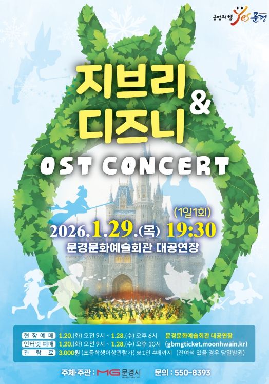 (포탈뉴스통신) 문경문화예술회관에서는 신년 겨울 방학을 맞아 인기 애니메이션 대표곡들을 들려주는 지브리 ·디즈니 OST 콘서트 공연을 1월 29일 19:30 (1일 1회)에 문경문화예술회관 대공연장에서 개최한다.