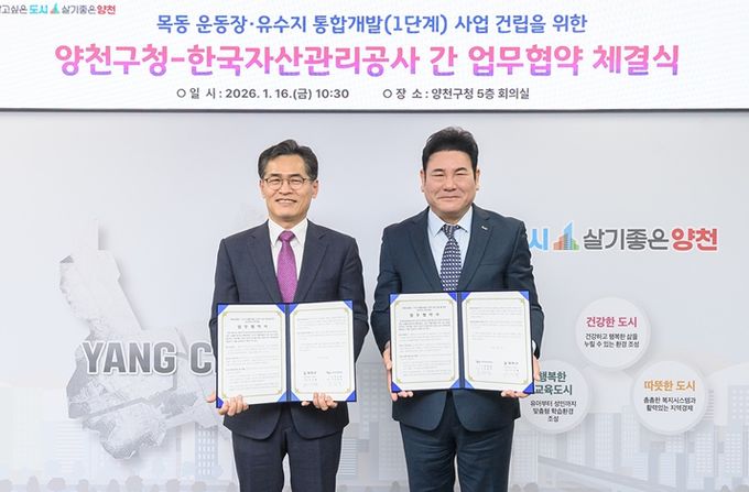 (포탈뉴스통신) 양천구가 1월 16일 한국자산관리공사와 업무협약을 체결하며, 목동운동장·유수지 일대 통합개발(목동MICE)을 위한 첫걸음을 내디뎠다.