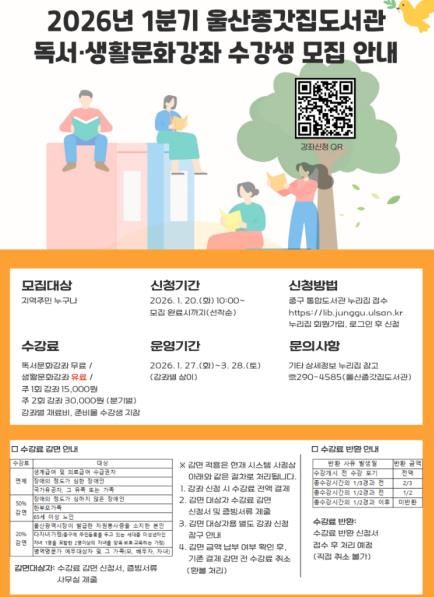 (포탈뉴스통신) 울산 중구에서 운영하는 울산종갓집도서관이 2026년 1분기 독서·생활문화강좌 수강생을 모집한다