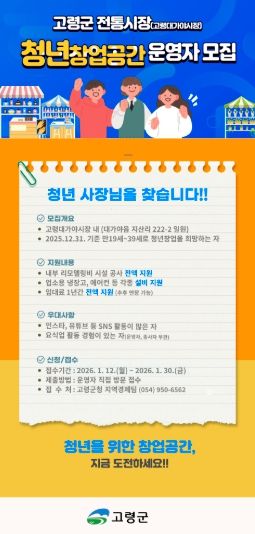 지역 대표 전통시장이자, 또 하나의 지역명소로 자리잡고 있는 고령대가야시장 내 새로운 활력 및 시장 이미지 개선을 도모하고, 청년층에 창업을 할 수 있는 기회를 제공하기 위한 본 사업은 지난 2024년 7월 4개 점포가 문을 연 데 이어, 2026년 고령군 청년창업공간의 확장 조성을 위해 금년 하반기 신규 2개소 추가 개점을 목표로 하고 있다.