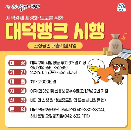 (포탈뉴스통신) 대전 대덕구는 경기침체로 자금 운용에 어려움을 겪는 지역 소상공인의 금융 부담을 완화하기 위해 소상공인 대출지원사업 ‘2026 대덕뱅크’를 시행한다.