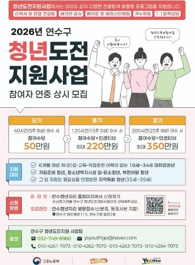 (포탈뉴스통신) 연수구는 청년들의 경제 활동과 노동시장 진입을 돕기 위해 ‘2026년 청년도전지원사업’ 참여자를 모집한다.