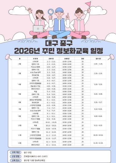 류규하 중구청장은 “디지털 환경 변화에 따라 행정과 일상에서 요구되는 정보 활용 능력도 점점 높아지고 있다”며 “기초 교육부터 최신 기술까지 아우르는 주민 정보화교육을 통해 구민 누구나 디지털 환경에 능동적으로 대응할 수 있도록 지원하겠다”고 말했다.