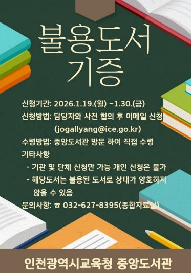 (포탈뉴스통신) 인천광역시교육청중앙도서관은 지역사회 내 도서 나눔 문화를 확산하고 지식 자원의 선순환을 실천하기 위해 ‘불용도서 기관 나눔’ 사업을 운영한다.