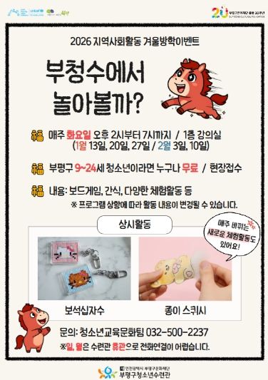 (포탈뉴스통신) 부평구 청소년수련관은 오는 20일부터 다음달 10일까지 겨울방학을 맞아 지역 청소년을 위한 2026 지역사회활동 겨울방학 이벤트 ‘부청수에서 놀아볼까’를 진행한다.