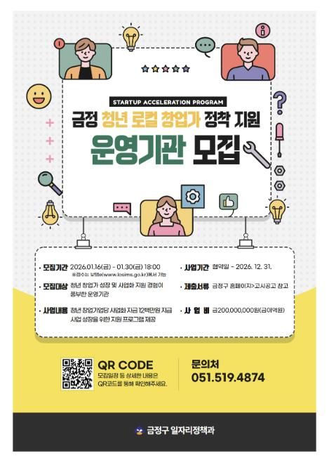 (포탈뉴스통신) 부산 금정구는 지역에 정착할 수 있는 청년 로컬 창업가를 육성하기 위해 ‘금정 청년 로컬 창업가 정착 지원’ 사업을 추진하고, 이를 운영할 운영기관(보조사업자)을 공개 모집한다고 밝혔다.