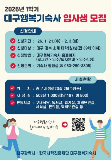 (포탈뉴스통신) 대구광역시는 한국사학진흥재단 대구행복기숙사(중구 수창동 소재)에 입주할 2026학년도 1학기 신규 입사생을 1월 21일부터 2월 3일까지 모집한다.
