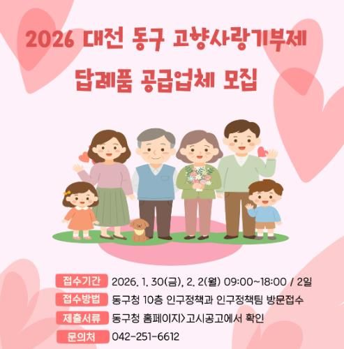 (포탈뉴스통신) 대전 동구는 이달 30일부터 다음 달 2일까지 주말을 제외한 이틀간, ‘2026년 고향사랑기부제 답례품 공급업체’를 추가 공개 모집한다고 20일 밝혔다.