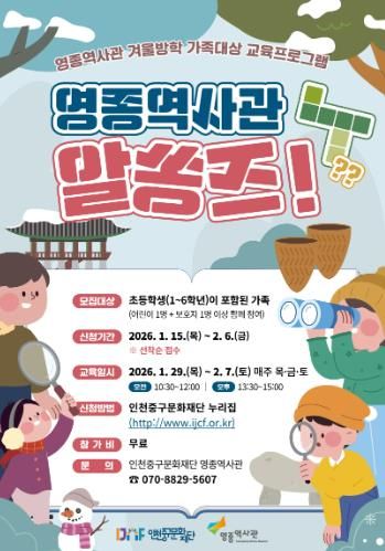 (포탈뉴스통신) 인천중구문화재단은 겨울방학을 맞아 가족이 함께 참여하는 체험형 교육프로그램 '영종역사관 알쏭즈!'의 참여자를 모집한다고 20일 밝혔다.