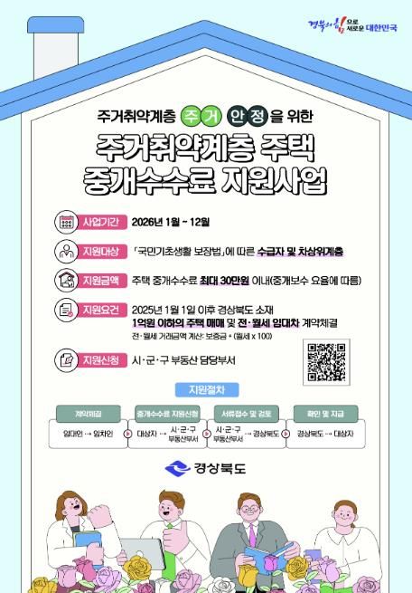 (포탈뉴스통신) 상주시는 주거 취약계층의 경제적 부담을 완화하고 안정적인 주거환경 조성을 위하여 2026년 1월부터 “주거 취약계층 주택 중개보수 지원사업”을 시행한다.