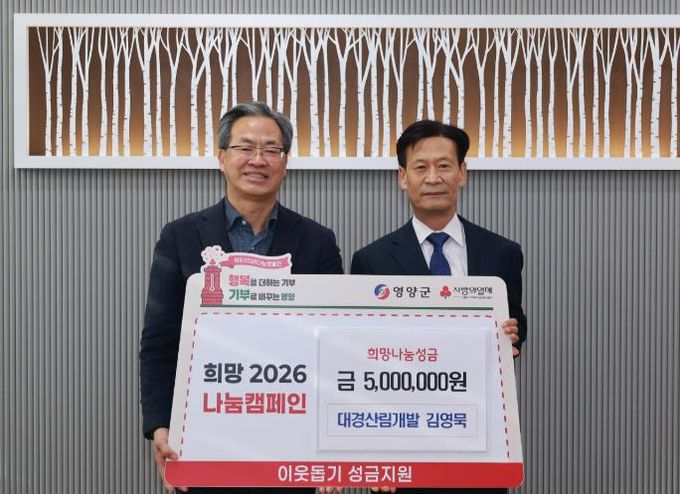 (포탈뉴스통신) 대경산림개발 대표 김영묵(전 농업경제건설국장)은 1월 21일 영양군을 방문해 지역의 어려운 이웃과 희망을 나누고자 성금 500만원을 기부하며 '희망2026나눔캠페인'에 동참했다.