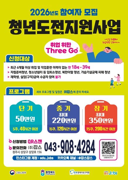 (포탈뉴스통신) 충북경제자유구역청은 구직 의욕이 낮아진 도내 청년들의 원활한 사회 진출을 돕기 위해 고용노동부가 주관하는 ‘2026년 청년도전 지원사업’의 국비 11억 6,000만 원을 확보하고 본격적인 참여자 모집에 나선다고 밝혔다.