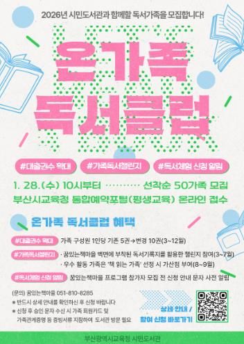 (포탈뉴스통신) 부산광역시립시민도서관은 오는 28일부터 영·유아 및 초등학생 자녀를 둔 가족을 대상으로 ‘온가족 독서클럽’ 참여 가족 50팀을 모집한다.