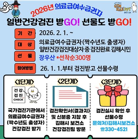 (포탈뉴스통신) 김해시보건소는 2026년 새해를 맞아 의료 취약계층의 질병을 조기에 발견하고 예방하기 위해 의료급여수급권자를 대상으로 『일반건강검진 받GO! 선물도 받GO!』 이벤트를 실시한다고 밝혔다.