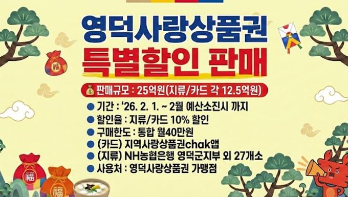 영덕군은 지난 1월 할인 판매의 높은 관심과 설 명절 수요를 반영해 2월 판매 규모를 기존의 두 배인 25억 원(지류·카드 각 12.5억 원)으로 확대했다.
