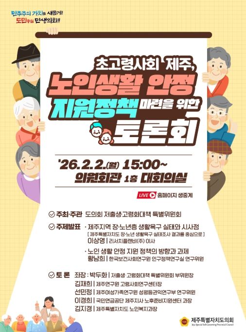 (포탈뉴스통신) 2일 제주도의회 대회의실에서 제주특별자치도의회 저출생‧고령화대책 특별위원회 주최‧주관으로 ‘노인 생활 안정 지원 정책 방향’ 정책토론회가 열린다.