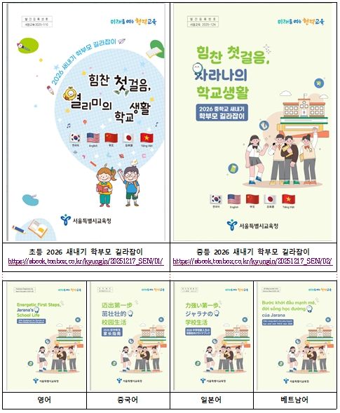 서울시교육청은 2026학년도에도 기존 초등 새내기 학부모 길라잡이를 최신 교육정책 변화에 맞춰 보완·개정했으며, 올해 처음으로 중학교 입학을 앞둔 학부모를 위한 '2026 중학교 새내기 학부모 길라잡이'를 신규로 편찬했다.