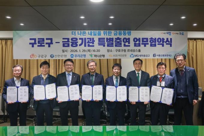 (포탈뉴스통신) 구로구가 1월 29일 구청 3층 르네상스홀에서 신한은행, 우리은행, 하나은행, 국민은행, 새마을금고, 서울신용보증재단과 ‘더 나은 내일을 위한 금융동행’ 특별출연 협약을 체결하고, 총 212억 5천만 원 규모의 중소기업·소상공인 특례보증을 추진한다.