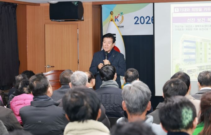 이날 박범인 군수를 비롯해 군의회, 지역 기관단체장, 주민 등 총 100여 명이 참석했으며 지역 발전을 위해 노력한 유공자 3명에게 표창패를 수여 후 2026년 군정 추진방향 설명과 함께 주민 의견을 직접 듣는 시간을 가졌다.