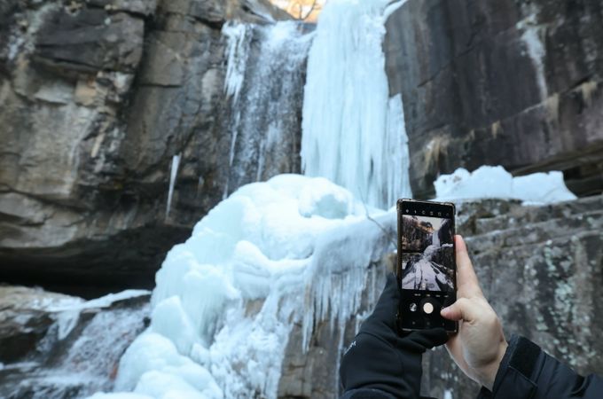 폭포 상단에서 떨어지던 물은 하단부로 갈수록 얼음과 눈이 겹겹이 쌓이며 계곡 전체를 고요한 겨울 풍경으로 바꿔 놓았다.