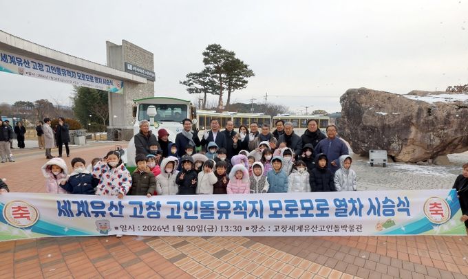30일 고창군에 따르면 이날 오후 고창 세계유산 고인돌박물관 일원에서 관광객과 지역주민이 함께한 체험형 시승식을 열었다. 고창의 대표 관광지인 세계유산 고인돌유적지에 새로운 활력을 불어넣는 관광콘텐츠로서 새로운 ‘모로모로 열차’의 출발을 알렸다.