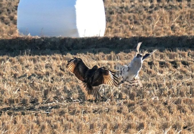 윤 작가는 “당시 참매가 사냥한 먹이(흰뺨검둥오리 추정) 일부를 먹기 시작하던 가운데 말똥가리가 날아와 먹이를 차지하려 두 맹금류 간 다툼이 짧게 발생했다”고 설명했다.