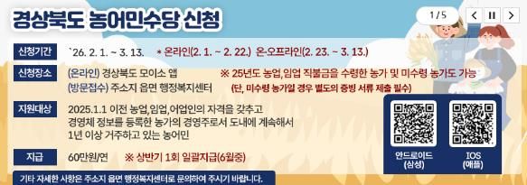 경상북도 농어민수당은 농가당 연 60만 원이 지급되며, 자격 요건 검증과 심의 절차를 거쳐 상반기 중 지역사랑상품권 또는 지역사랑선불카드 형태로 지급될 예정이다.
