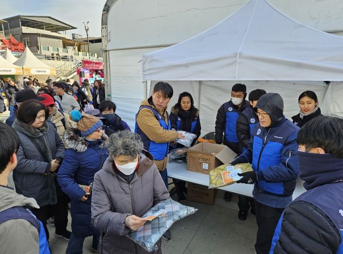 영동양수건설소 임정묵 소장과 직원들은 축제장을 방문한 군민과 관람객에게 홍보 기념품(핫팩 2,000개, 무릎담요 500개)을 배부하며 영동곶감의 우수성을 알렸다.