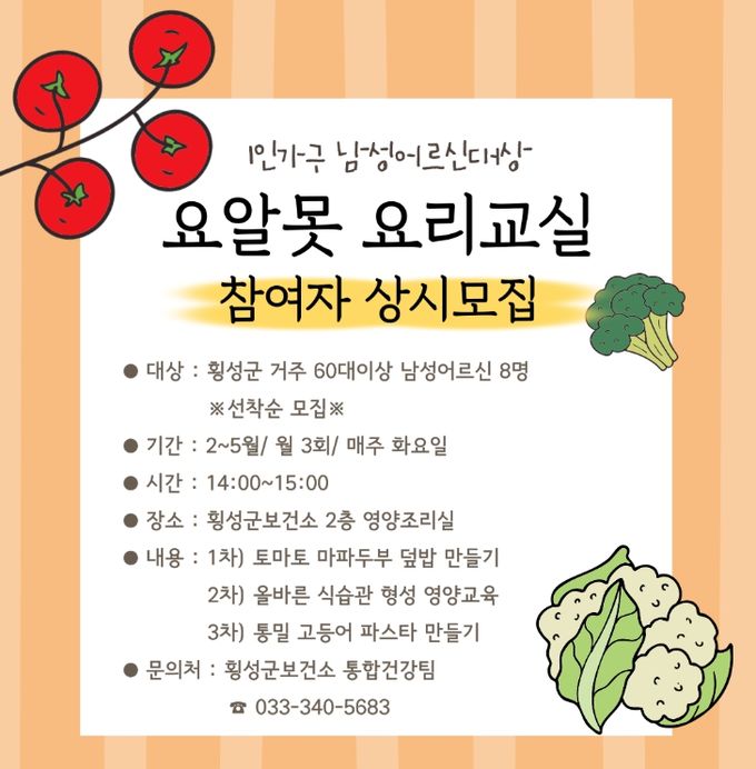 (포탈뉴스통신) 횡성군은 1인가구 남성 어르신의 건강한 식생활 형성과 영양관리 강화를 위해 2월부터 5월까지 “요알못(요리를 알지 못하는) 영양교실”을 운영한다.