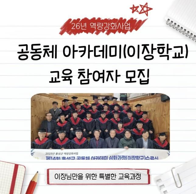 (포탈뉴스통신) 홍성군 마을만들기지원센터는 마을 운영과 의사결정의 핵심 주체인 마을리더의 역량 강화를 위해 공동체 아카데미 심화과정 ‘이장학교’ 참여자를 모집한다.