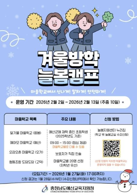 해당 늘봄학교는 예산군에 재학 중인 초등학생을 대상으로 2월 3일부터 14일까지 10일간 마을학교 형태로 진행되며, 마을별 특성을 반영한 돌봄·체험 중심 프로그램과 체계적인 안전 관리를 통해 학부모의 돌봄 부담을 덜어줄 계획이다.