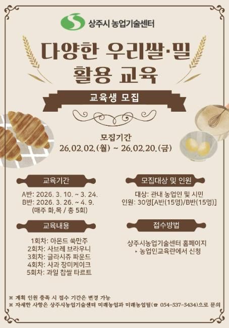 (포탈뉴스통신) 상주시농업기술센터는 2월 2일부터 2월 20일까지‘다양한 우리쌀·밀 활용 교육’교육생을 모집한다고 밝혔다.