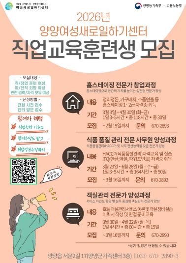 (포탈뉴스통신) 양양여성새로일하기센터는 취·창업을 희망하는 여성을 대상으로 2026년도 직업교육훈련생 50명을 모집한다.
