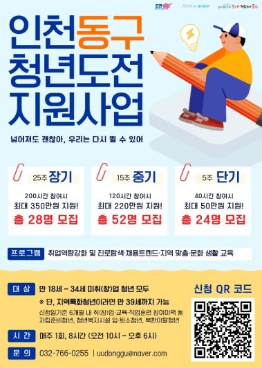 신청은 고용24 또는 유유기지 동구청년21 누리집의 청년도전지원 게시판을 이용해 온라인으로 신청할 수 있다. 문의 사항은 동구 청년도전지원사업팀(032-766-0255)으로 문의하면 된다.