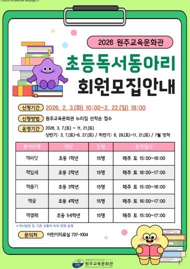 (포탈뉴스통신) 원주교육문화관(관장 용석태)은 2월 3일부터 선정 도서를 깊이 읽는 활동을 통해 문해력을 강화하고 지역사회 독서 공동체를 활성화하기 위해 초등학생과 중학생을 대상으로 ‘2026년 독서동아리 회원 모집’을 실시한다.