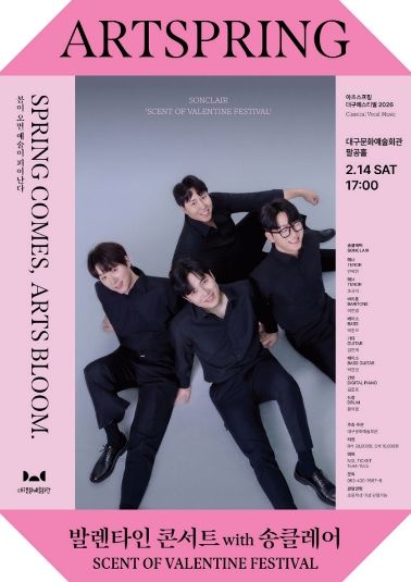 (포탈뉴스통신) 대구문화예술진흥원 대구문화예술회관은 오는 2월 14일 오후 5시, 팔공홀에서 지역 성악가로 구성된 남성 4인조 크로스오버 보컬 그룹 송클레어(SONCLAIR)와 함께하는 ‘발렌타인 콘서트 with 송클레어 – Scent of Valentine Festival’을 개최한다.