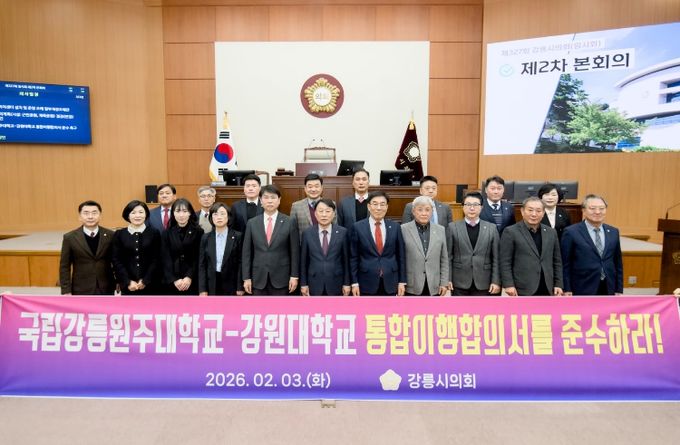 (포탈뉴스통신) 강릉시의회는 3일 제327회 강릉시의회(임시회) 제2차 본회의에서 조대영 의원의 대표발의로 ‘국립강릉원주대학교-강원대학교 통합이행합의서 준수 촉구 성명서’를 발의했다.