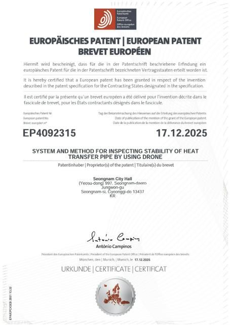(포탈뉴스통신) 성남시가 자체 개발한 ‘드론을 이용한 열수송관 안정성 검사 시스템’이 유럽특허(등록번호 EP4092315) 등록을 완료했다고 밝혔다. 이는 시 최초의 해외특허 등록 사례로, 지식재산의 해외 권리화를 통해 유럽 수출길을 여는 계기가 될 것으로 기대된다.