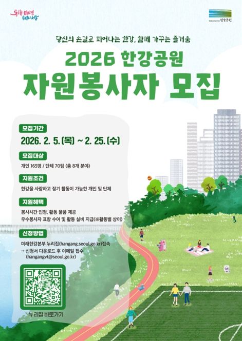 (포탈뉴스통신) 서울시 미래한강본부가 시민의 손길로 한강의 가치를 피워내고 함께 가꾸는 즐거움을 공유할 ‘2026년 한강공원 정기 자원봉사자’를 모집한다. 접수 기간은 2월 5일부터 2월 25일까지 약 3주 간이다.