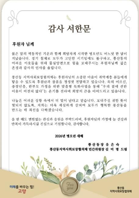 (포탈뉴스통신) 고양특례시 일산동구 풍산동 지역사회보장협의체는 설명절을 앞둔 지난 3일 지난해 지역사회의 어려운 이웃을 위해 따뜻한 나눔을 실천한 후원자들에게 감사의 마음을 담은 서한문을 발송했다.