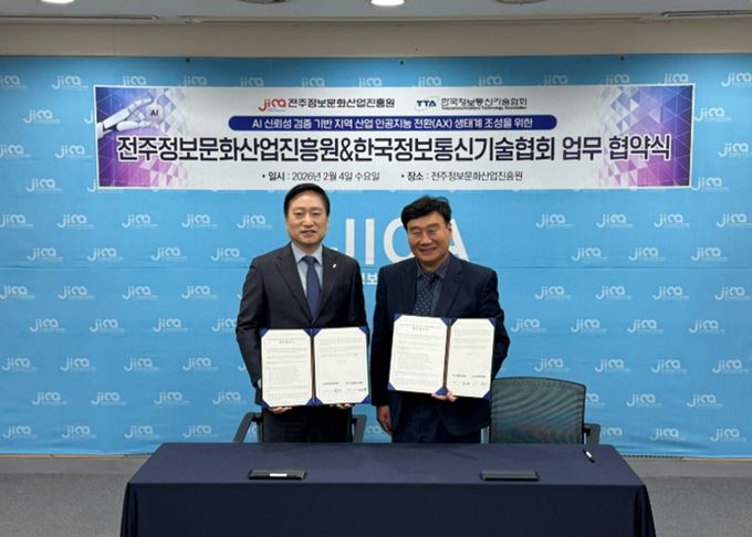 (포탈뉴스통신) 전주시 출연기관인 전주정보문화산업진흥원은 4일 진흥원 멀티미디어기술지원센터 1층 세미나실에서 한국정보통신기술협회와 AI 신뢰성 검증 기반 지역 산업 인공지능 디지털 전환(AX) 생태계 조성을 위한 업무협약을 체결했다.