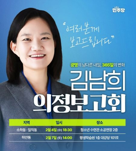 한편, 의정보고회 일정은 ▲2월 4일 오후 6시 30분 소하동·일직동(광명시청소년수련관 2층 소공연장), ▲2월 7일 오후 2시 하안동(광명시 평생학습원 대강당 101호)에서 각각 진행된다.