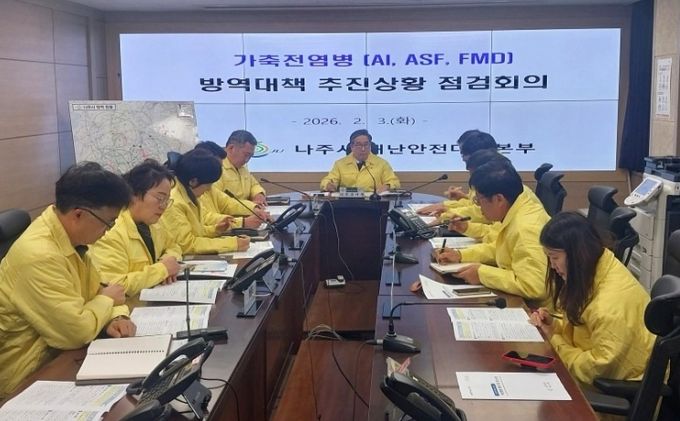 나주시는 지난 3일 강상구 부시장 주재로 가축전염병 상황점검회의를 열고 설 연휴 전후 사람과 차량 이동 증가에 따른 가축전염병 발생 위험에 대비해 관계부서와 함께 대응 방안을 논의했다고 4일 밝혔다.