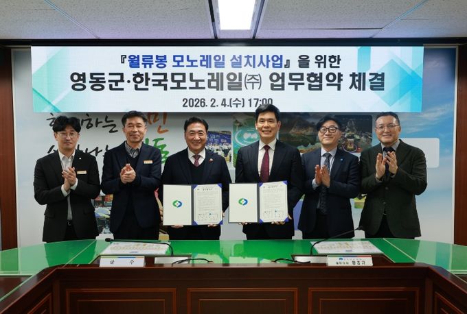영동군은 4일 오후 군청 상황실에서 한국모노레일㈜과 월류봉 모노레일 설치를 위한 업무협약(MOU)을 체결하고, 민·관 협력을 바탕으로 관광 인프라를 확충해 체류형 관광 활성화에 나선다고 밝혔다.