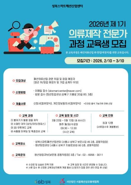 (포탈뉴스통신) 서울 성북구가 (사)서울패션섬유봉제협회에 위탁 운영 중인 성북스마트패션산업센터에서 2026년 제1기 의류제작 전문가과정 교육생을 모집한다.