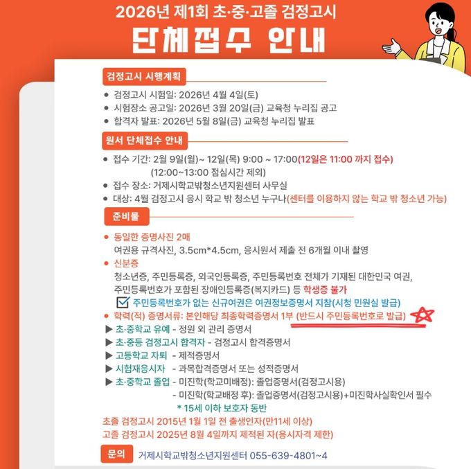 (포탈뉴스통신) 거제시학교밖청소년지원센터는'2026년 제1회 초・중・고 졸업학력 검정고시'응시자를 위해 2월 9일 09:00부터 12일 17:00까지 학교 밖 청소년을 대상으로 단체 원서 접수를 지원한다고 밝혔다.